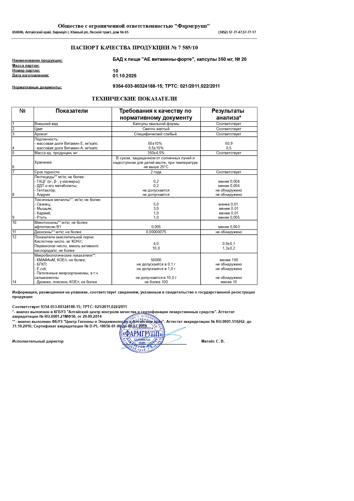АЕ витамины-форте, капс. 0,35 г № 20 БАД "Фармгрупп"