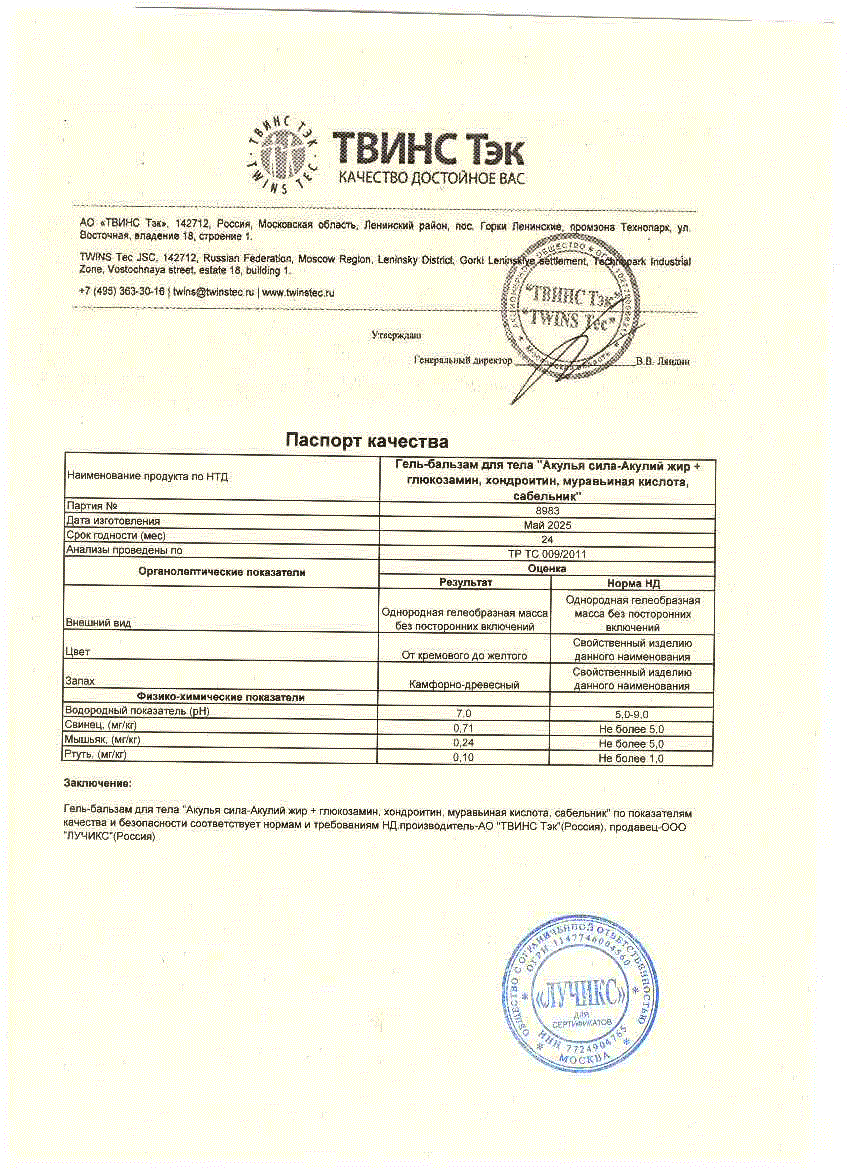 Акулий жир - Акулья Сила гель-бальзам для тела глюкозамин, хондроитин, муравьиная кислота, сабельник, 100 мл,