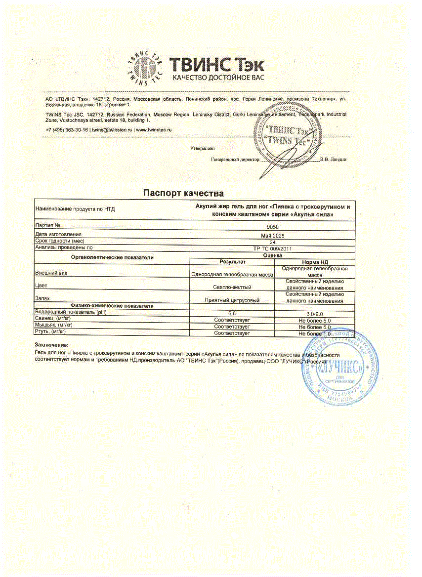 Гель для ног рекомендуется применять при варикозном расширении вен, поверхностном тромбофлебите, сосудистой сеточке, венозной недостаточности, отёчности, ощущении усталости и тяжести в ногах. Входящие в состав геля акулий жир и конский каштан улучшают микроциркуляцию крови, оказывают тонизирующее, противоотечное и лимфодренажное действие, восстанавливают тонус и эластичность стенок сосудов, укрепляют капилляры и уменьшают их проницаемость. Экстракт пиявки и троксерутин способствуют разжижению крови и растворению тромбов в кровеносных сосудах. Гель улучшает эстетический вид ног, устраняя вздутые вены, сосудистую сеточку, «звездочки», «паучки», создает легкое приятное ощущение прохлады, расслабляет, снимает усталость и тяжесть в ногах, обеспечивая чувство комфорта. Гель идеально подходит для ежедневного применения после долгого рабочего дня.