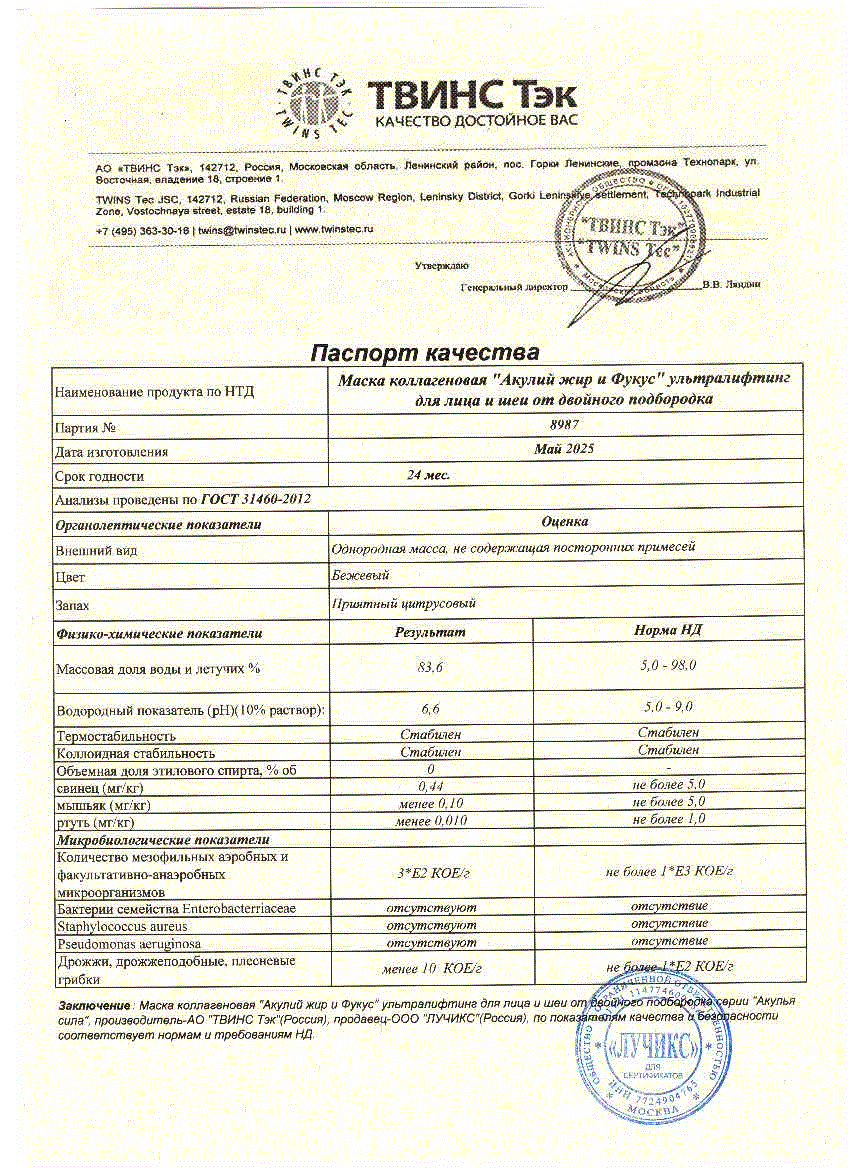 Акулий жир с Фукусом маска коллагеновая ультралифтинг для лица и шеи, от двойного подбородка, 10 мл, "Акулья сила"