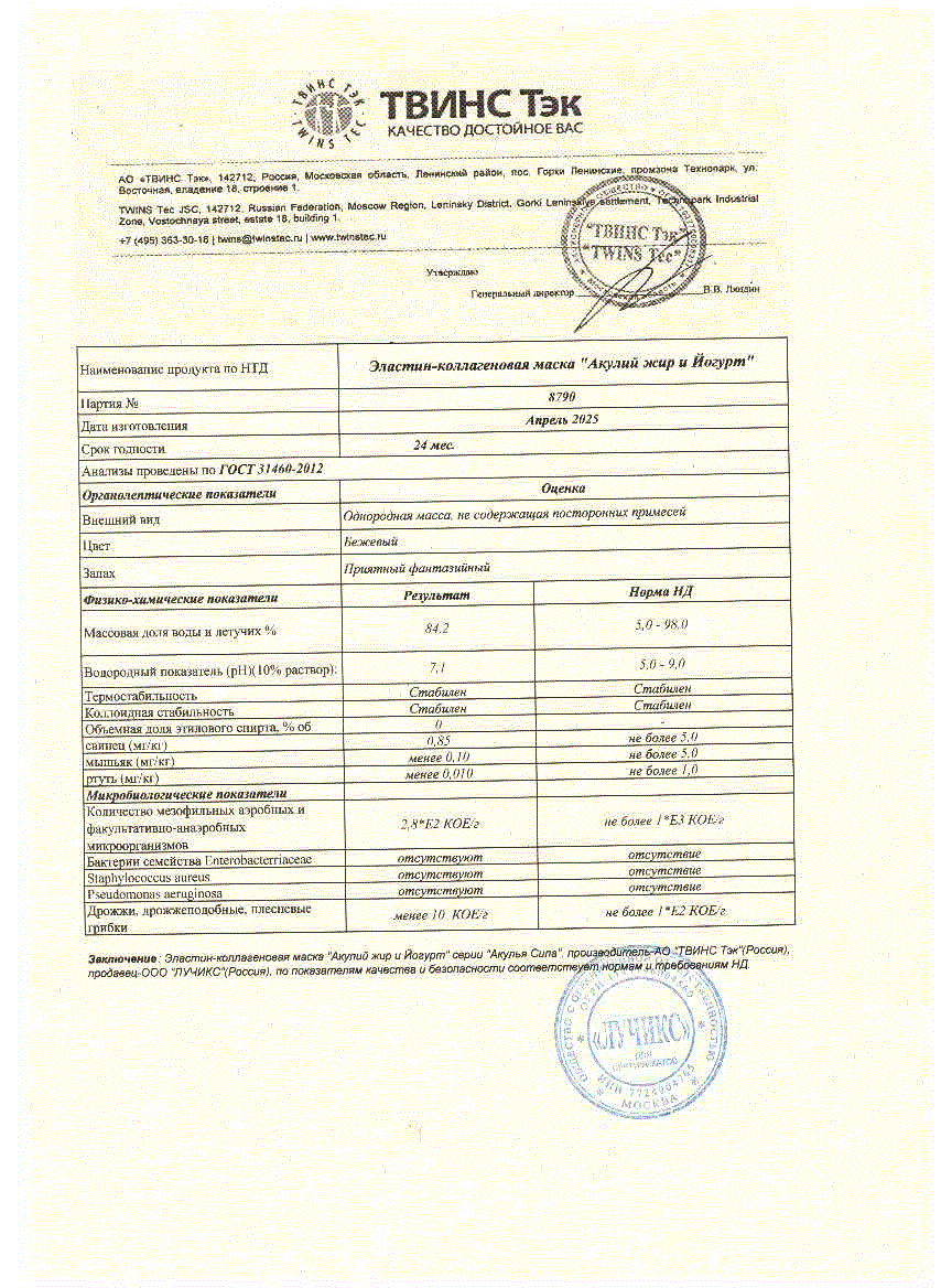 Маска оказывает выраженное тонизирующее, лифтинговое и увлажняющее действия. Коллаген увлажняет кожу, улучшает ее тонус и разглаживает мелкие морщины. Йогурт смягчает, увлажняет и тонизирует кожу. Эфирные масла и акулий жир освежают и омолаживают, восстанавливают упругость и эластичность кожи и подкожных тканей, способствуют разглаживанию мелких и глубоких морщин. При длительном использовании маски заметно улучшается цвет лица, замедляются процессы старения, разглаживаются морщины.