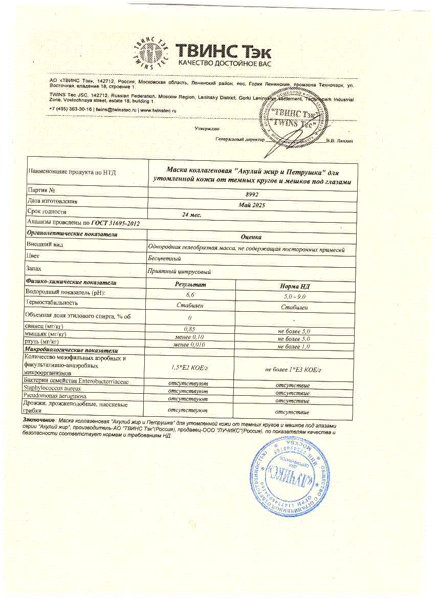 Коллагеновая маска "Акулий жир и петрушка" для утомленной кожи от темных кругов и мешков под глазами.