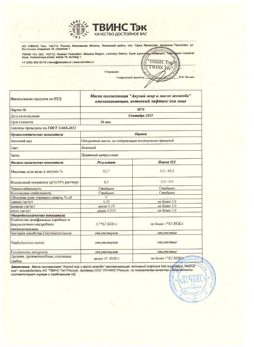 "Акулий жир и масло жожоба" - коллагеновая омолаживающая маска с эффектом активного лифтинга для лица.