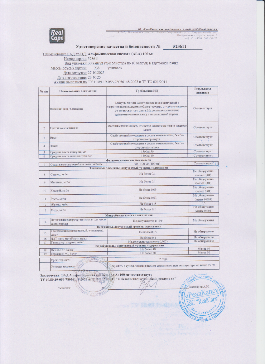 Альфа-липоевая кислота (ALA) 100 мг капс.1500мг №30 БАД