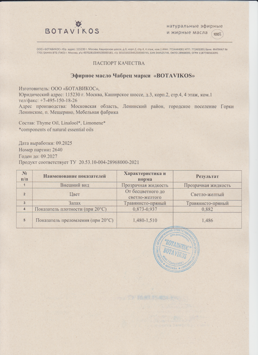 Чабрец 100% эфирное масло 10 мл, "Botavikos"