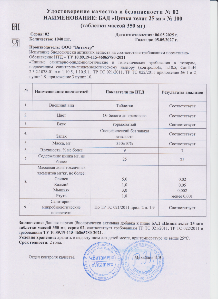 Цинка хелат № 100 табл. массой 350 мг БАД Витамер