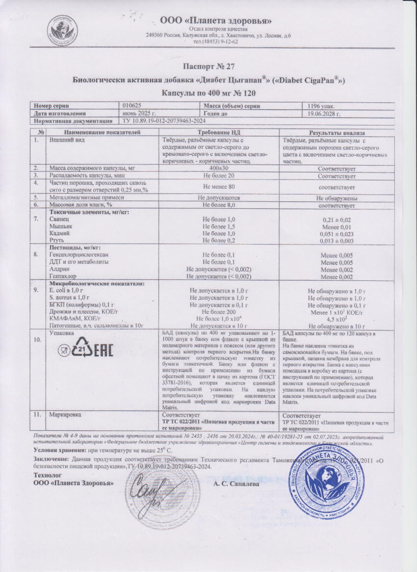 Цыгапан ДИАБЕТ кап 400мг №120 БАД