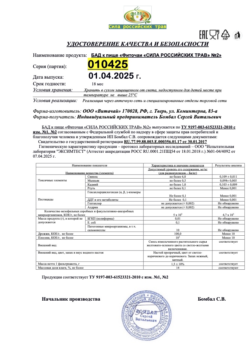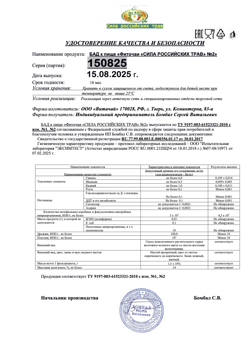 Фиточай "Сила российских трав" № 2: нормализующий сон, БАД, 20 ф/п х 1,5 г