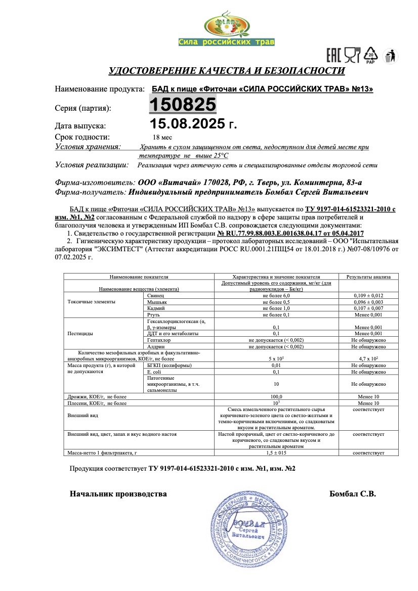Фиточай "Сила российских трав" №13: поджелудочный, БАД, 20 ф/п х 1,5 г