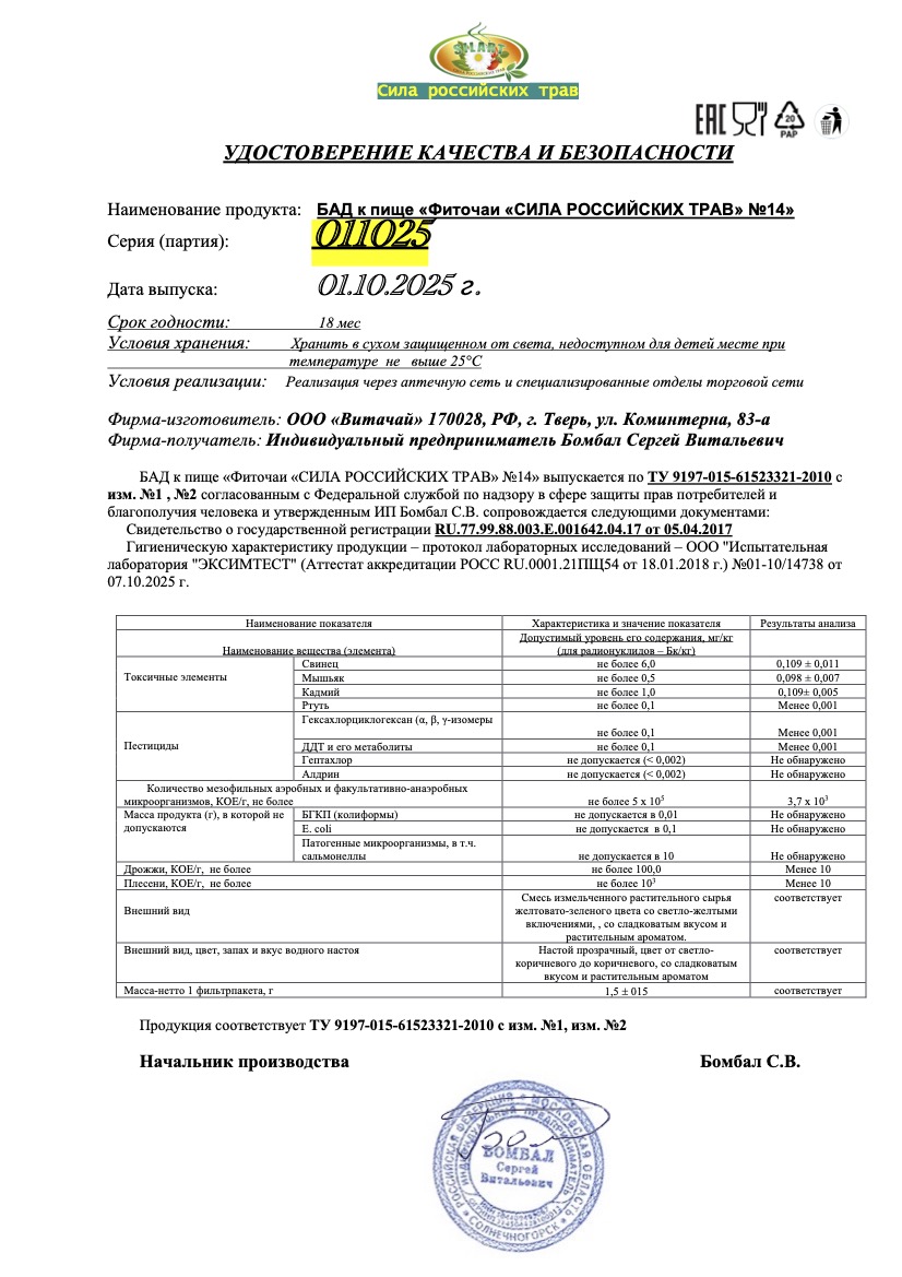 Сочетание компонентов именно в пропорции, входящей в состав, пользуется в народе заслуженным авторитетом как лечебное травяное средство и позволяет нам гарантировать Вам полный успех в случае длительного и правильного применения. В состав фиточая вошли только съедобные, приятные на вкус и полезные для здоровья растения.