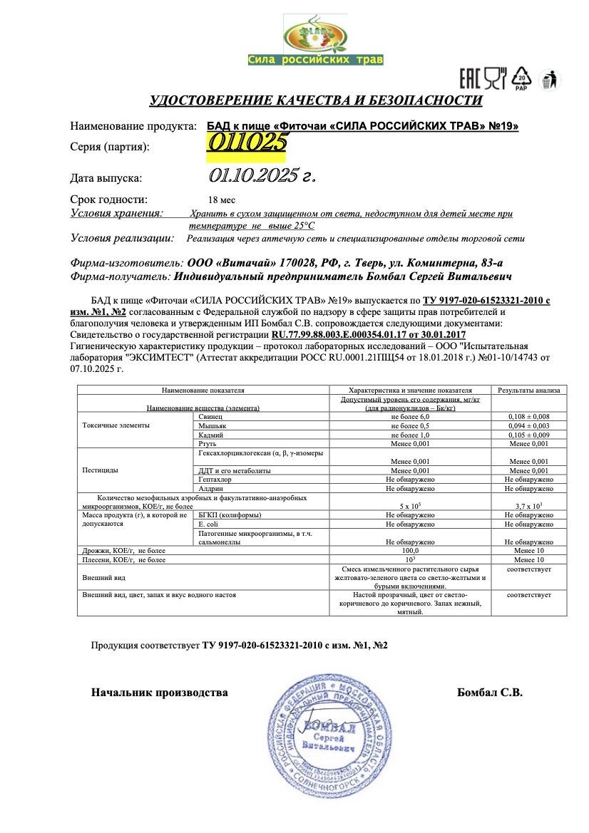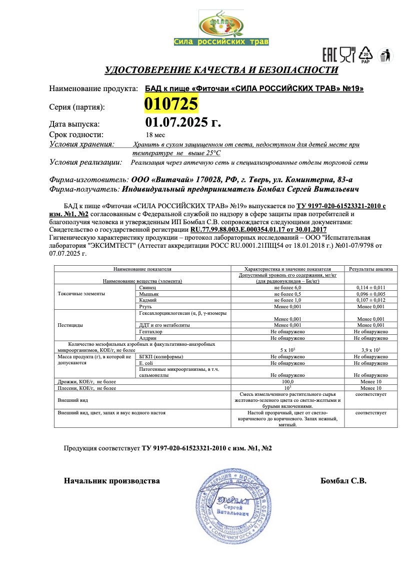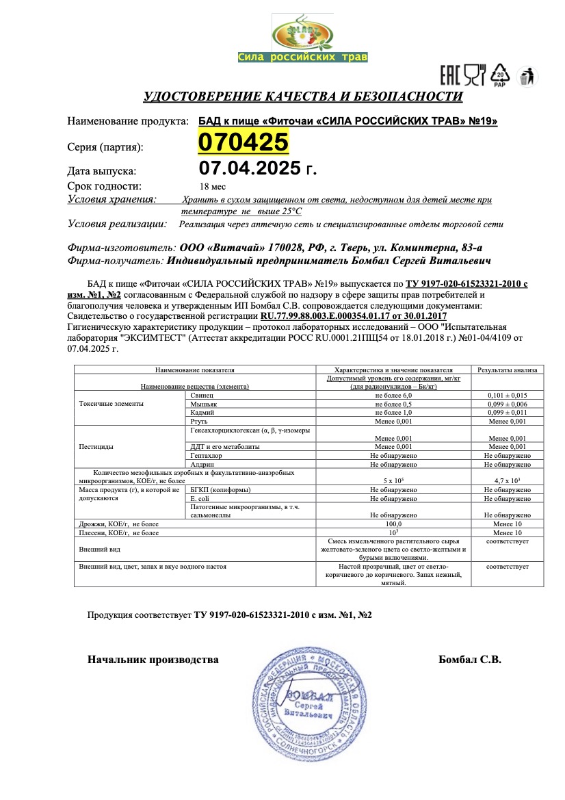 Фиточай "Сила российских трав" №19: для снижения сахара, БАД, 20 ф/п х 1,5 г