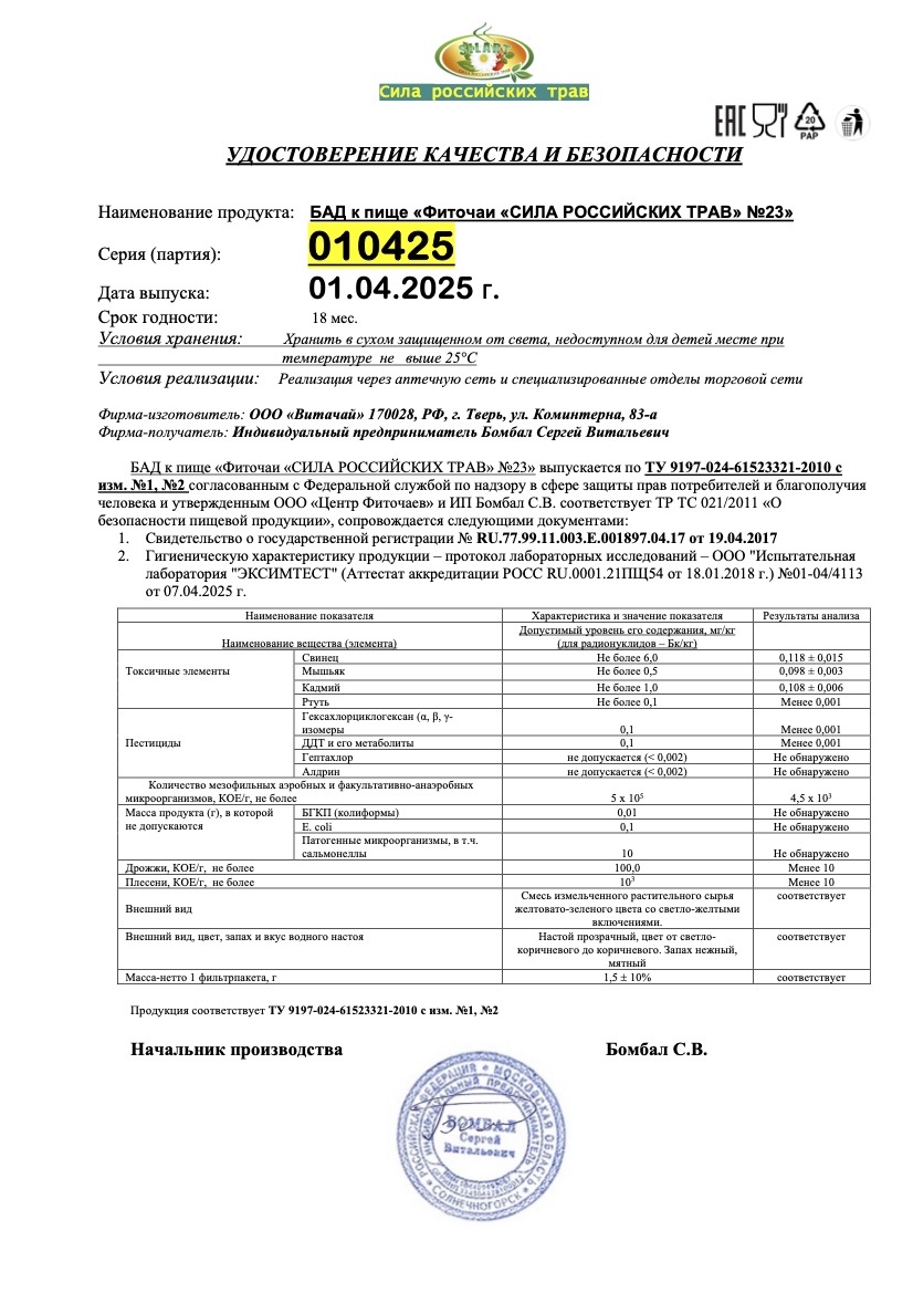 Фиточай "Сила российских трав" №23: успокаивающий, БАД, 20 ф/п х 1,5 г