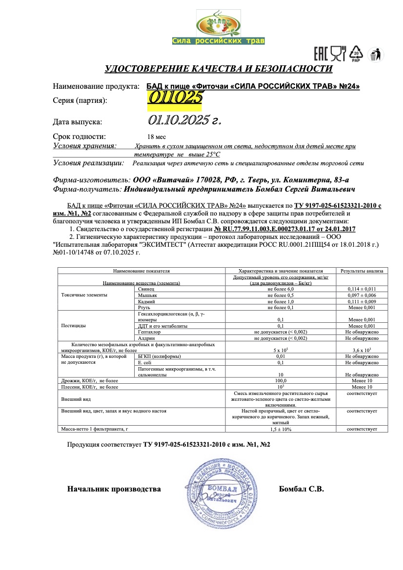 Фиточай "Сила российских трав" №24: при заболевании печени, БАД, 20 ф/п х 1,5 г