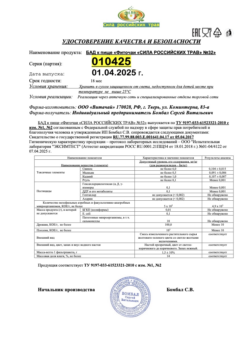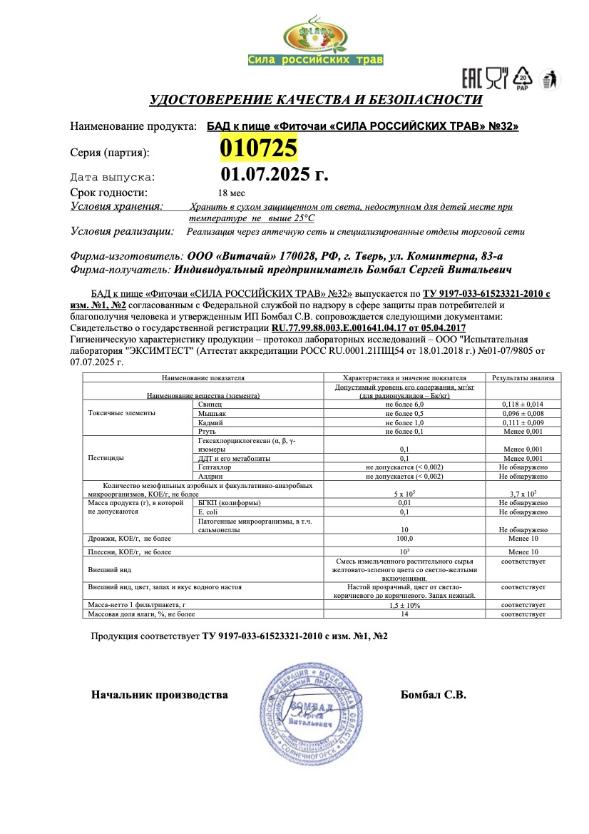Фиточай "Сила российских трав" №32: очищающий, БАД, 20 ф/п х 1,5 г