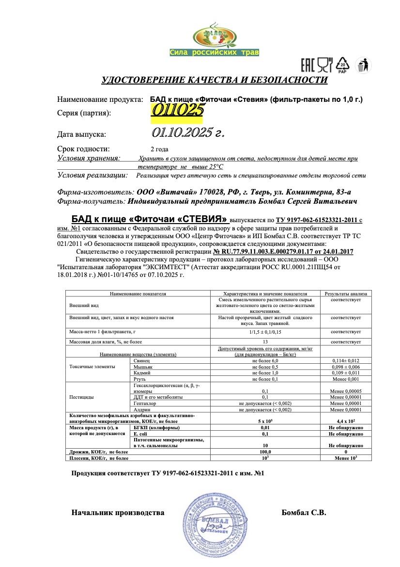 Фиточай "Стевия", "Сила российских трав": натуральный сахарозаменитель, БАД, 20 ф/п х 1 г