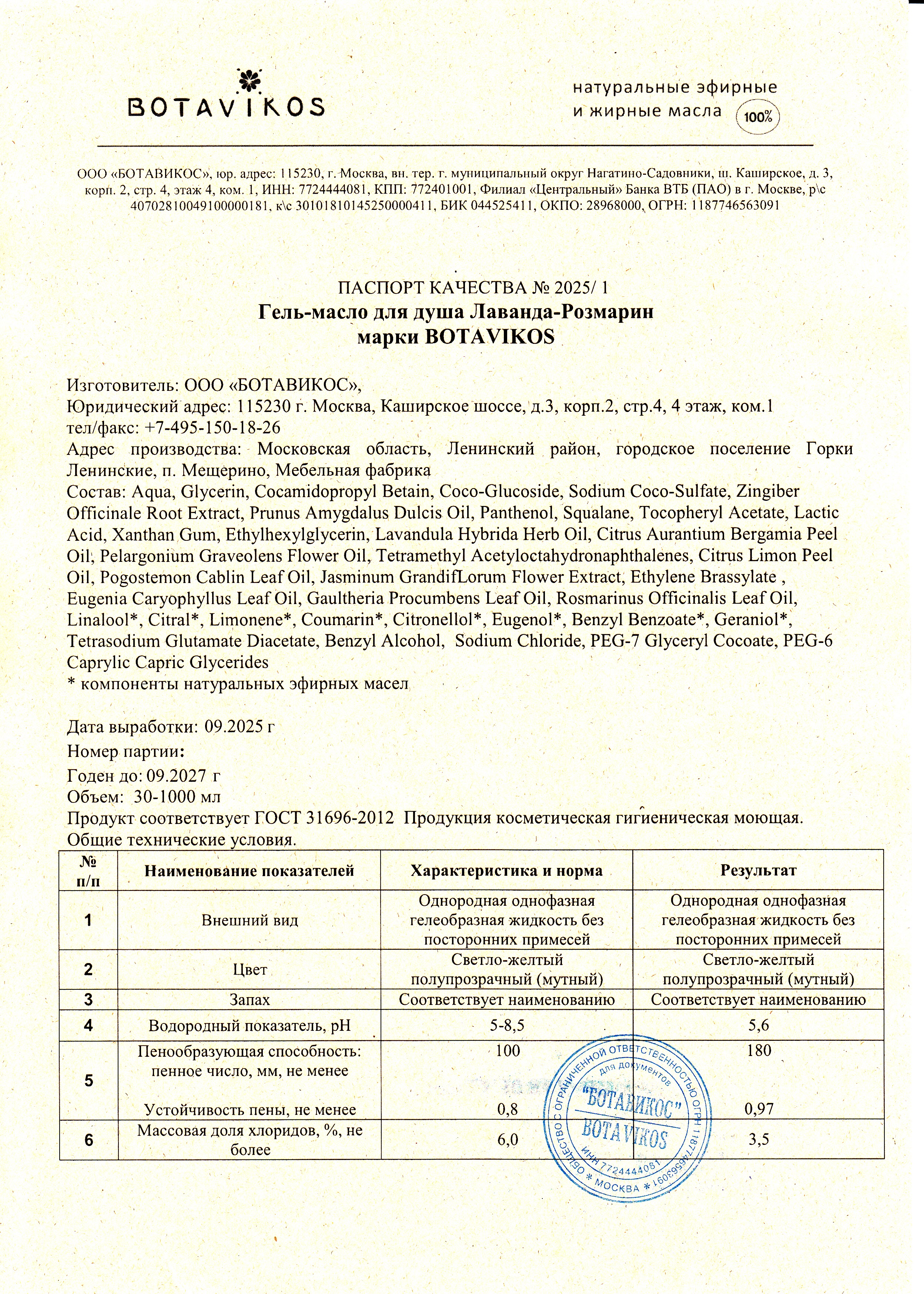 Гель-масло для душа Лаванда-Розмарин не содержит силиконов, парабенов, минеральных масел, компонентов животного происхождения, не тестируется на животных.