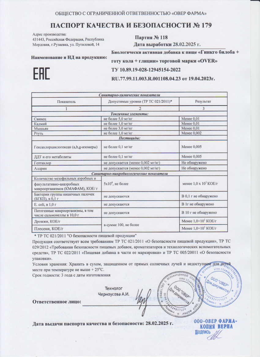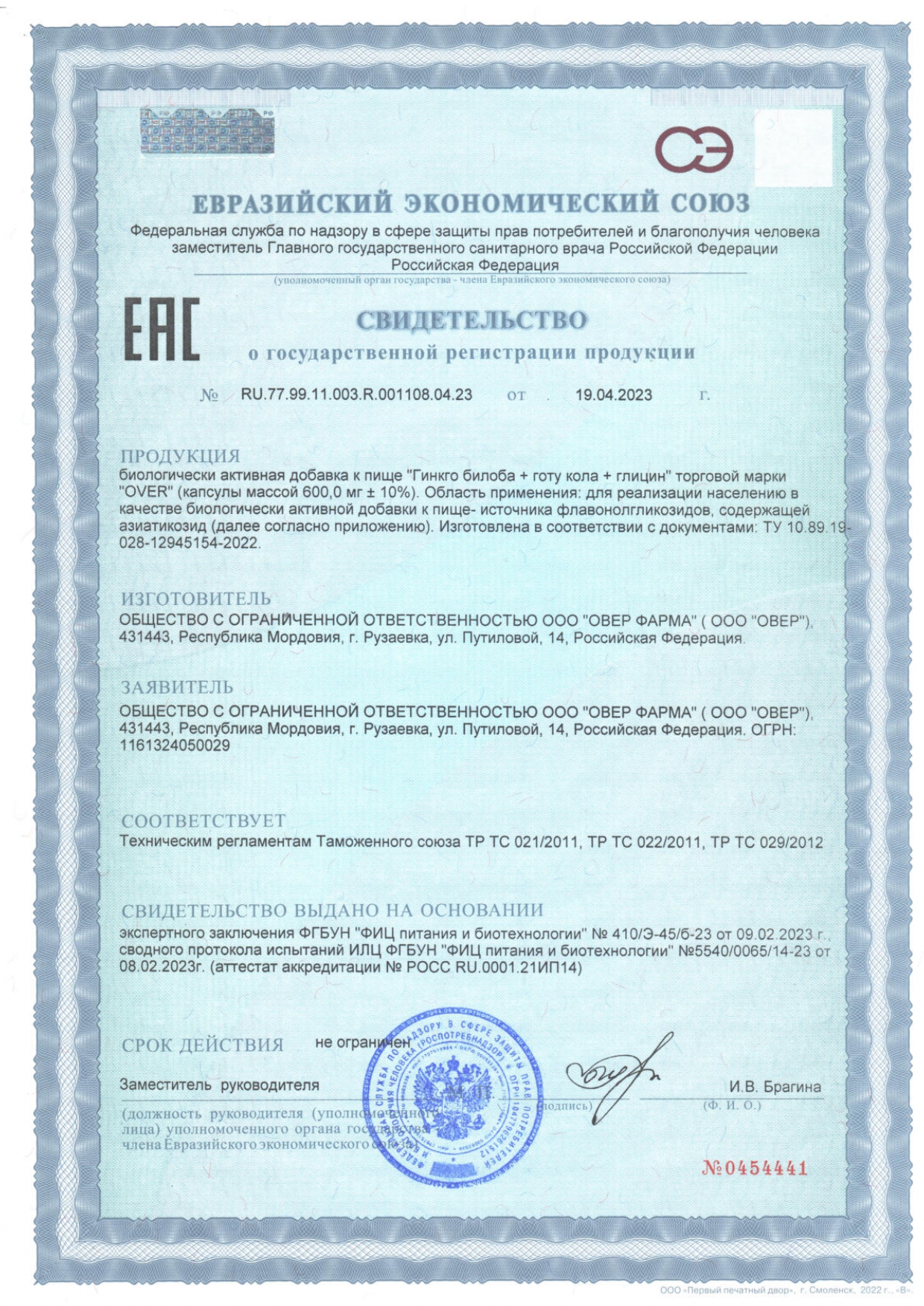 Гинкго билоба+Готу кола+Глицин 60 капсул (OVERvit) БАД