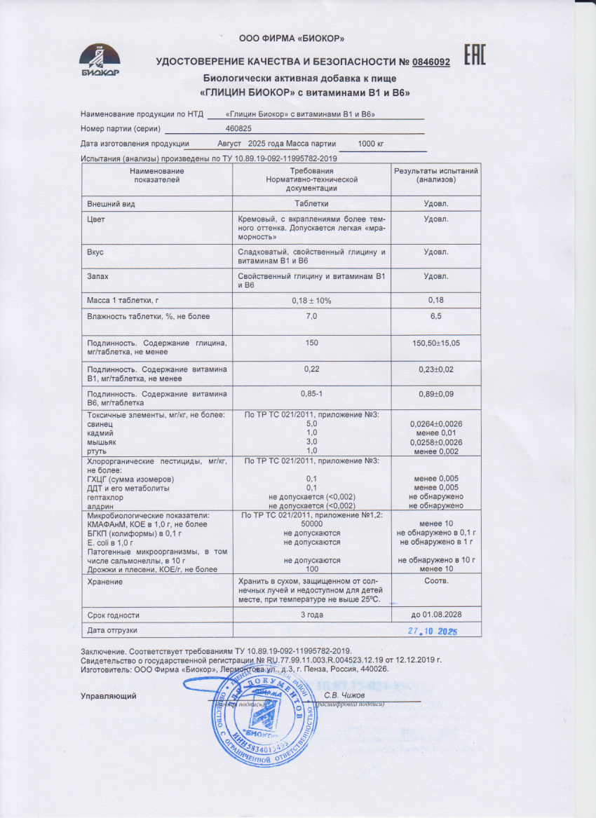 Глицин с витаминами В1 и В6, №60х0,18г БАД Биокор