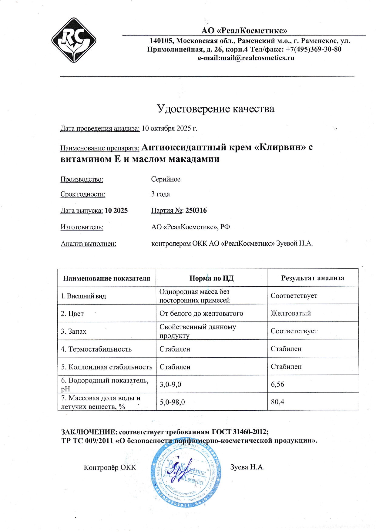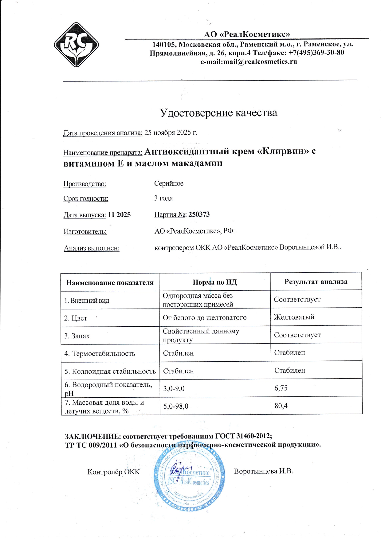Антиоксидантный крем «Клирвин» с витамином Е и маслом макадамии –Обладает антиоксидантными свойствами.
