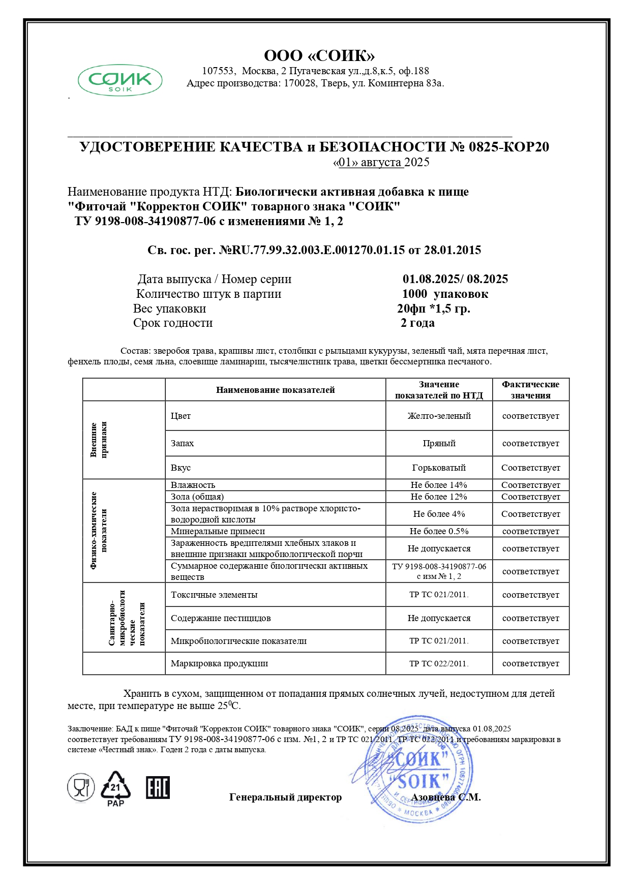 Эффективность использования фиточая "Корректон" подтверждена в системе добровольной сертификации. Сертификат соответствия 77.99.01.RU.Ф.A00310.01.08 от 22.01.08