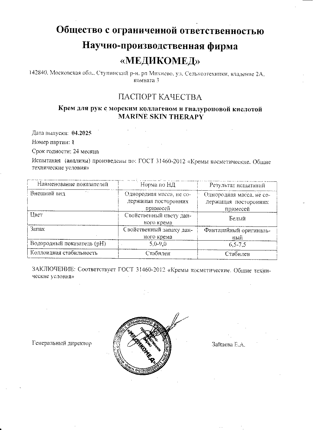 Крем для рук с морским коллагеном и гиалуроновой кислотой marine skin therapy банка 50 мл "МедикоМед"