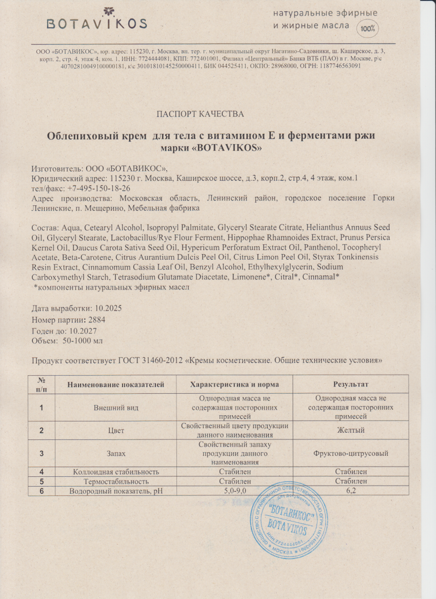 Читать далееКрем облепиховый для тела с витамином Е и ферментами ржи. Питание и увлажнение, 250мл "Botavikos"