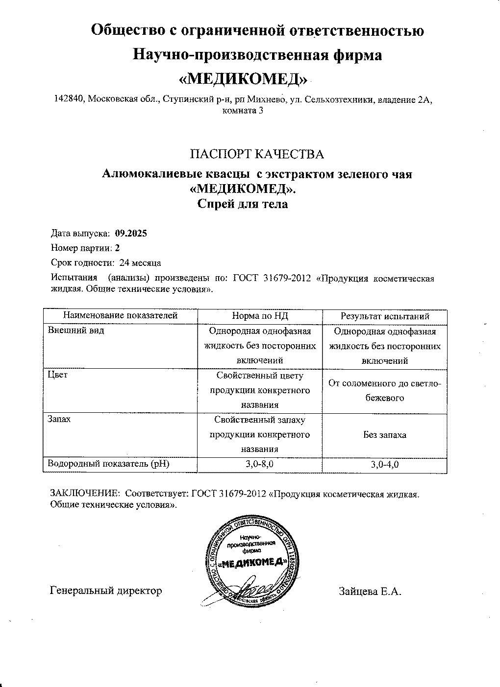 Квасцы алюмокалиевые с экстрактом зеленого чая, спрей для тела, 100 мл, "МедикоМед"