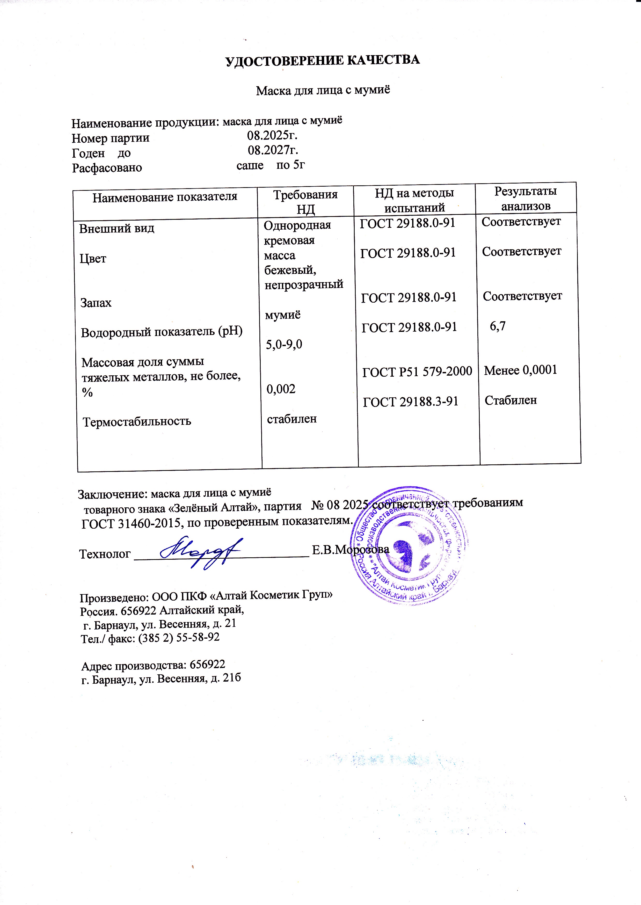 Маска является косметическим средством, в основе которого лежит природный компонент - Алтайское мумиё. Благодаря ему достигается максимальный видимый лифтинг-эффект на коже лица: морщины становятся менее заметными, кожа приобретает здоровый внешний вид и упругость.