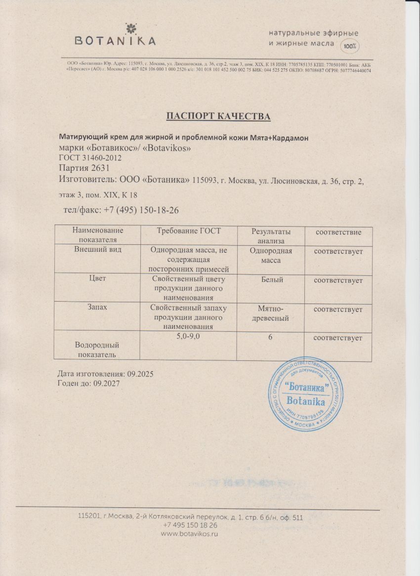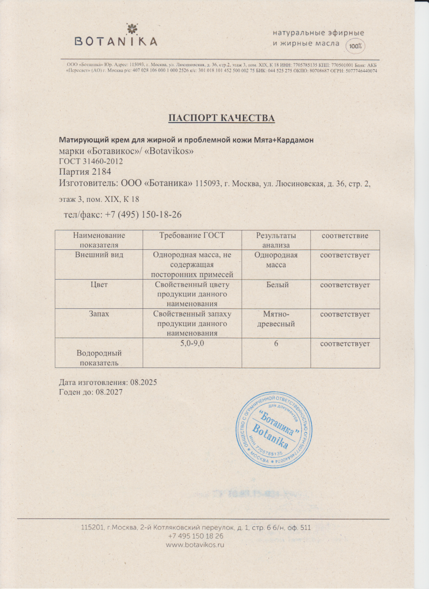 Читать далееМатирующий крем для жирной и проблемной кожи лица Мята + Кардамон, 50 мл, "Botavikos"