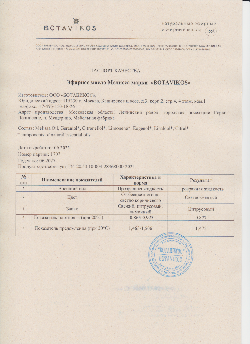 Мелисса 100% эфирное масло 10 мл, "Botavikos"