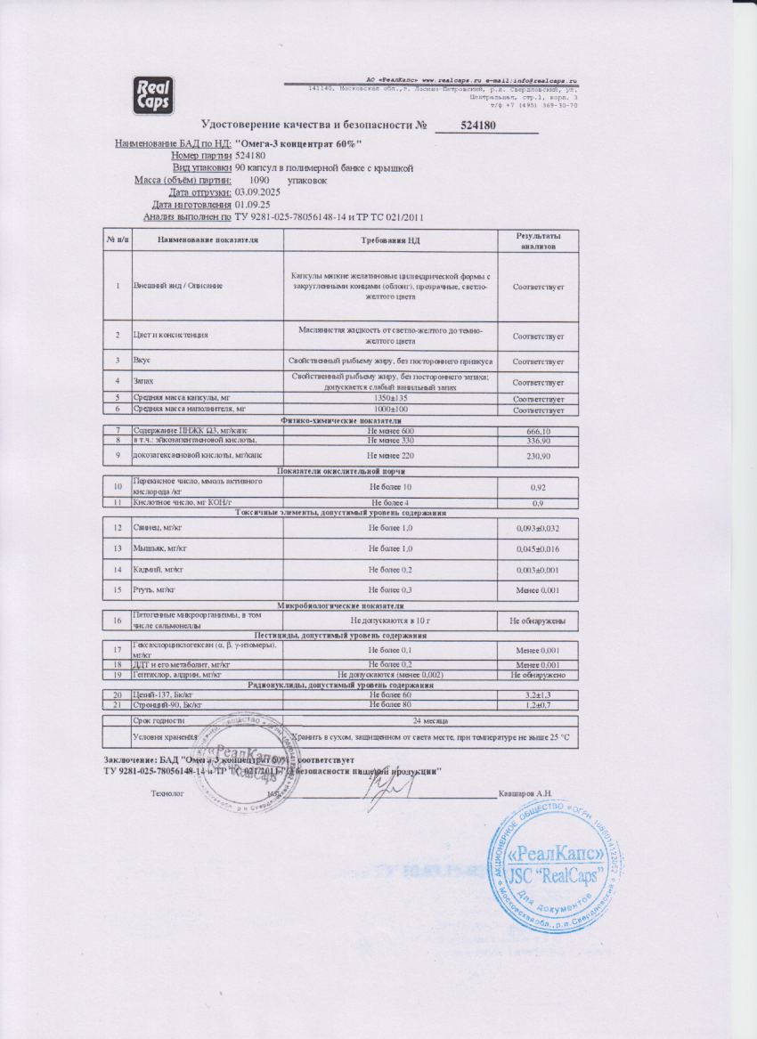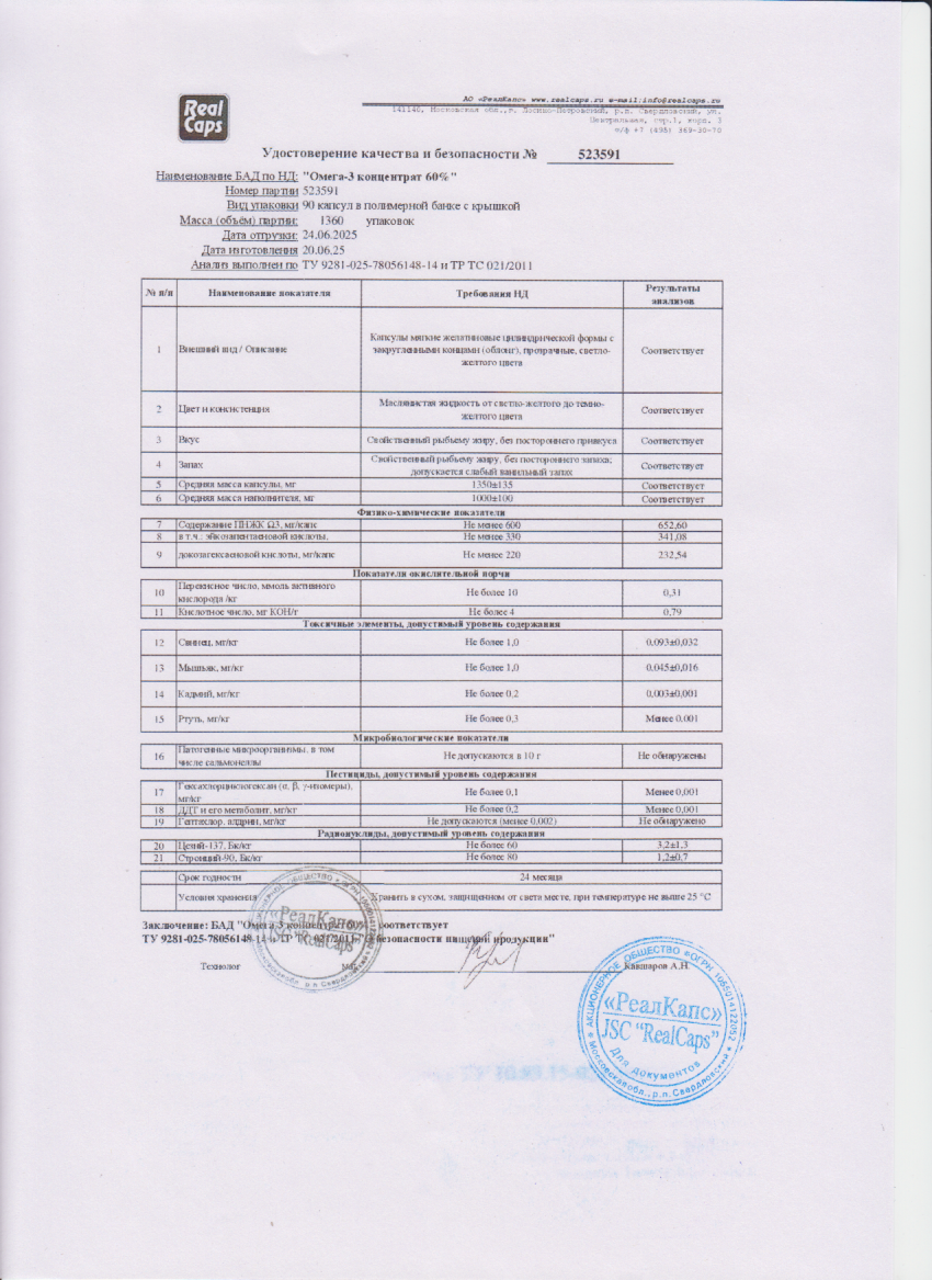 ПНЖК Омега 3 - 60 не менее %, в том числе эйкозапентаеновая кислота - 33%, докозагексаеновая кислота -22%.