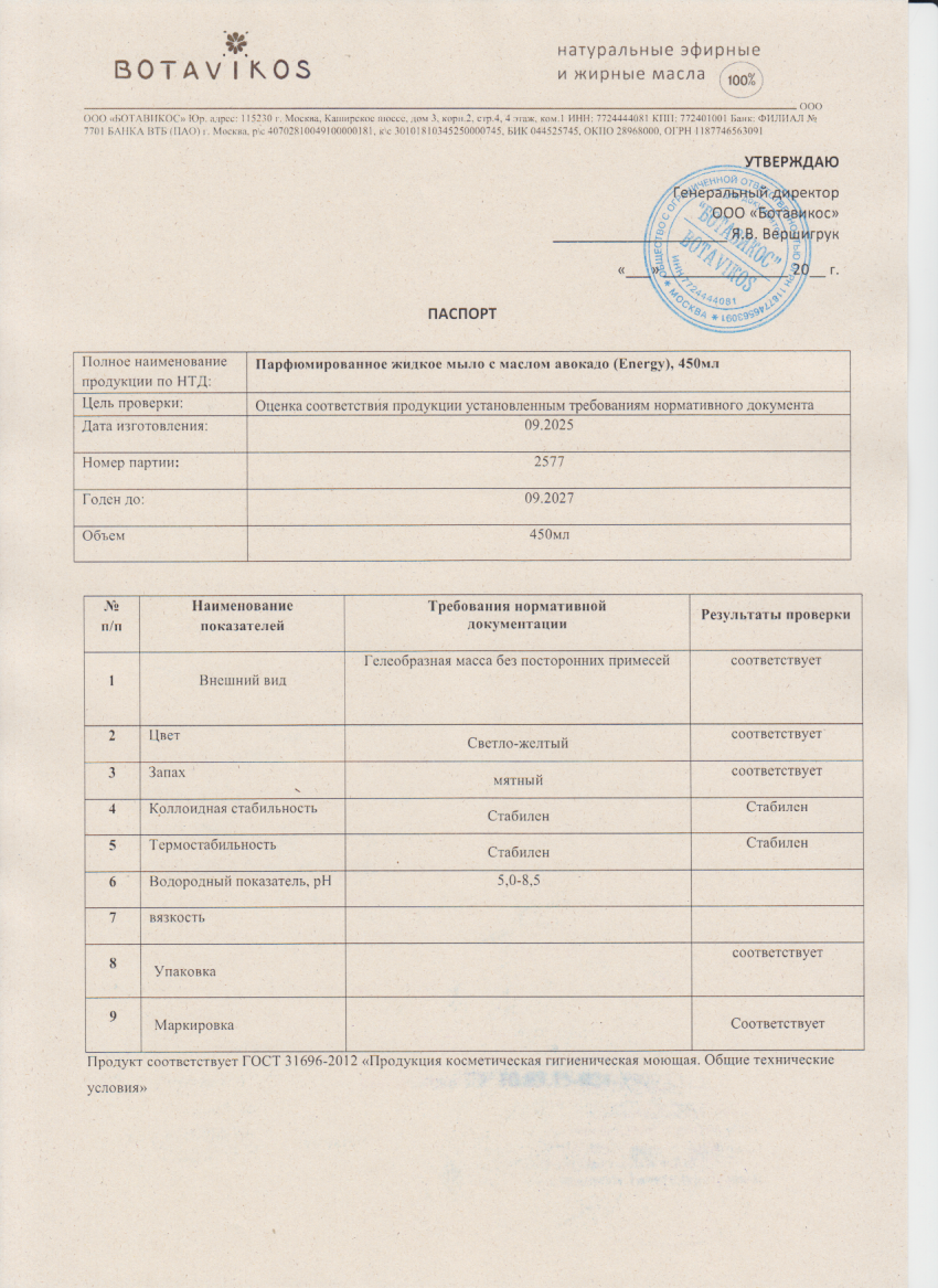 Жидкое мыло парфюмированное с маслом авокадо ( Energy), 450мл БОТАВИКОС