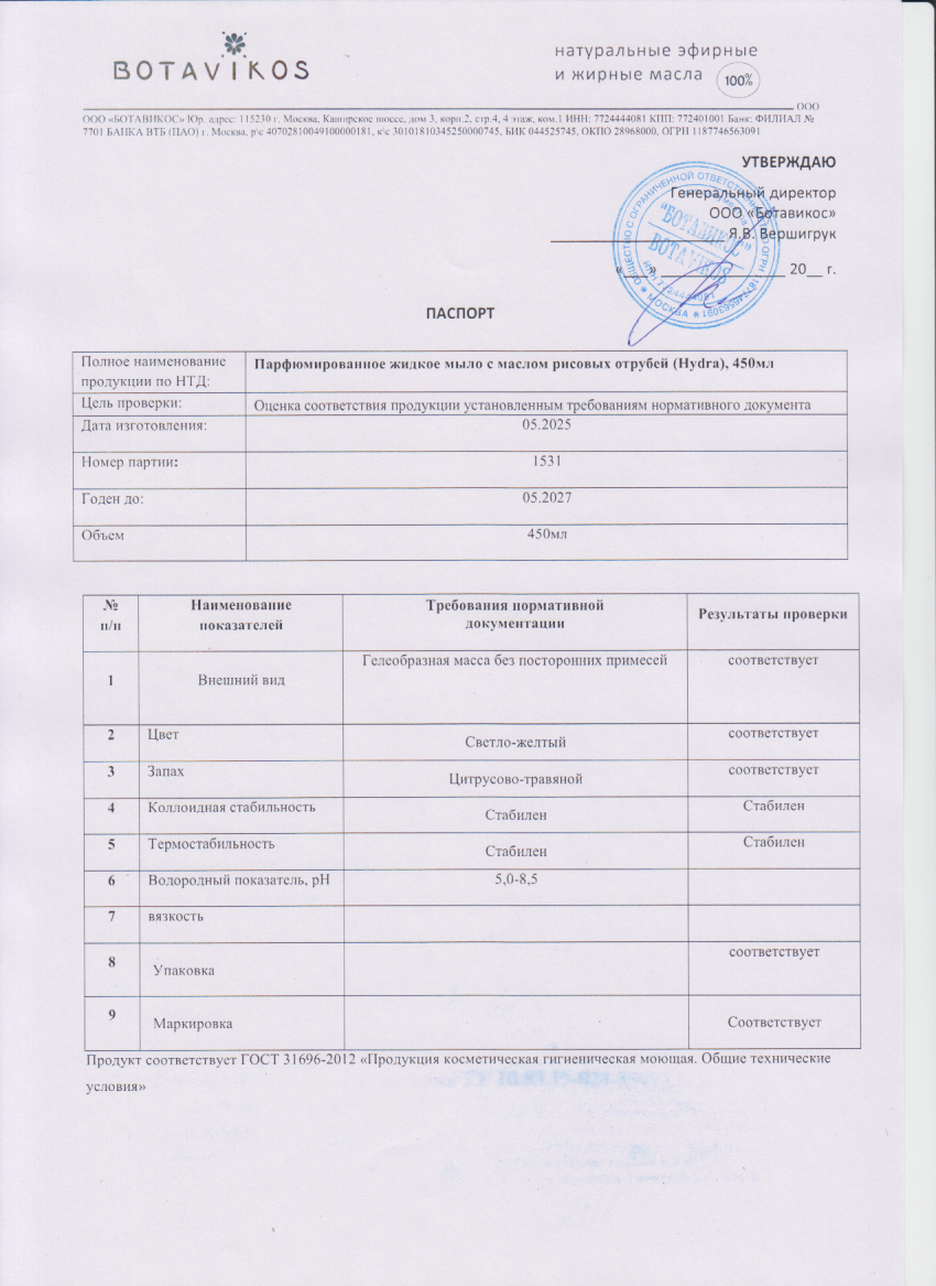 Читать далееЖидкое мыло парфюмированное с маслом рисовых отрубей (Hydra), 450мл БОТАВИКОС