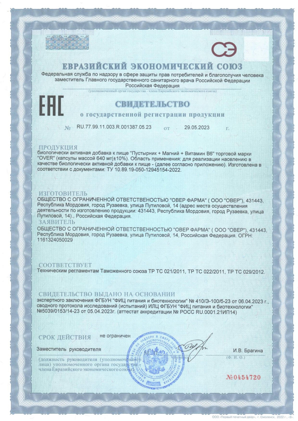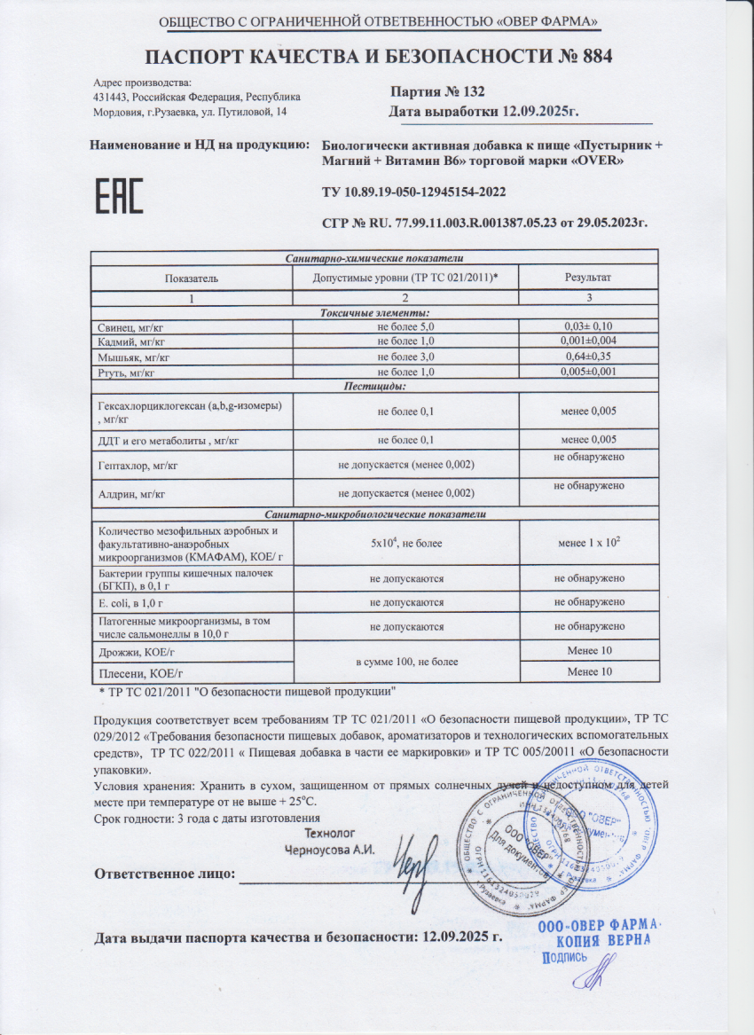 Пустырник+Магний+Витамин В6 60 капсул (OVERvit) БАД