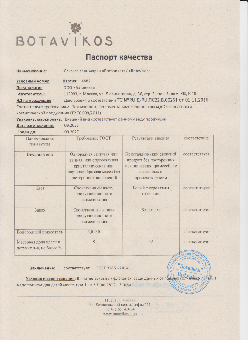 Сакская соль богата важнейшими биоактивными элементами, выработанными в период цветения морских водорослей. Содержит зеленую морскую водоросль Дуналиелла солоноводная (Dunaliella salina)- богатейший источник натуральных каротиноидов-антиоксидантов: бета-каротина (провитамин А), лютеина, виолоксантина, антераксатина, а также глицерола, витаминов и ненасыщенных жирных кислот. Химический состав сакской морской соли дополняют соединения йода, меди, брома, кальция, натрия, магния.