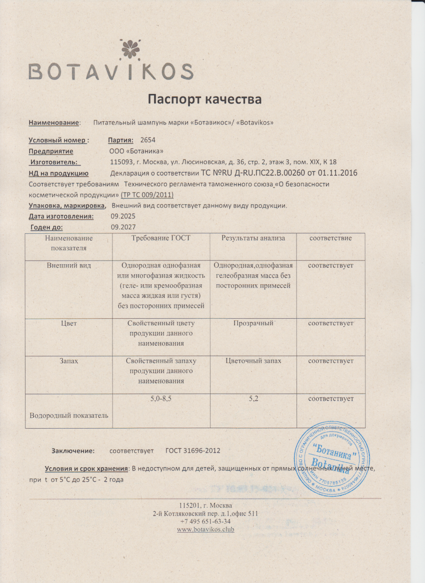 Натуральные ингредиенты, входящие в состав шампуня, способствуют качественному очищению волос и кожи головы, интенсивному питанию, увеличению объема.