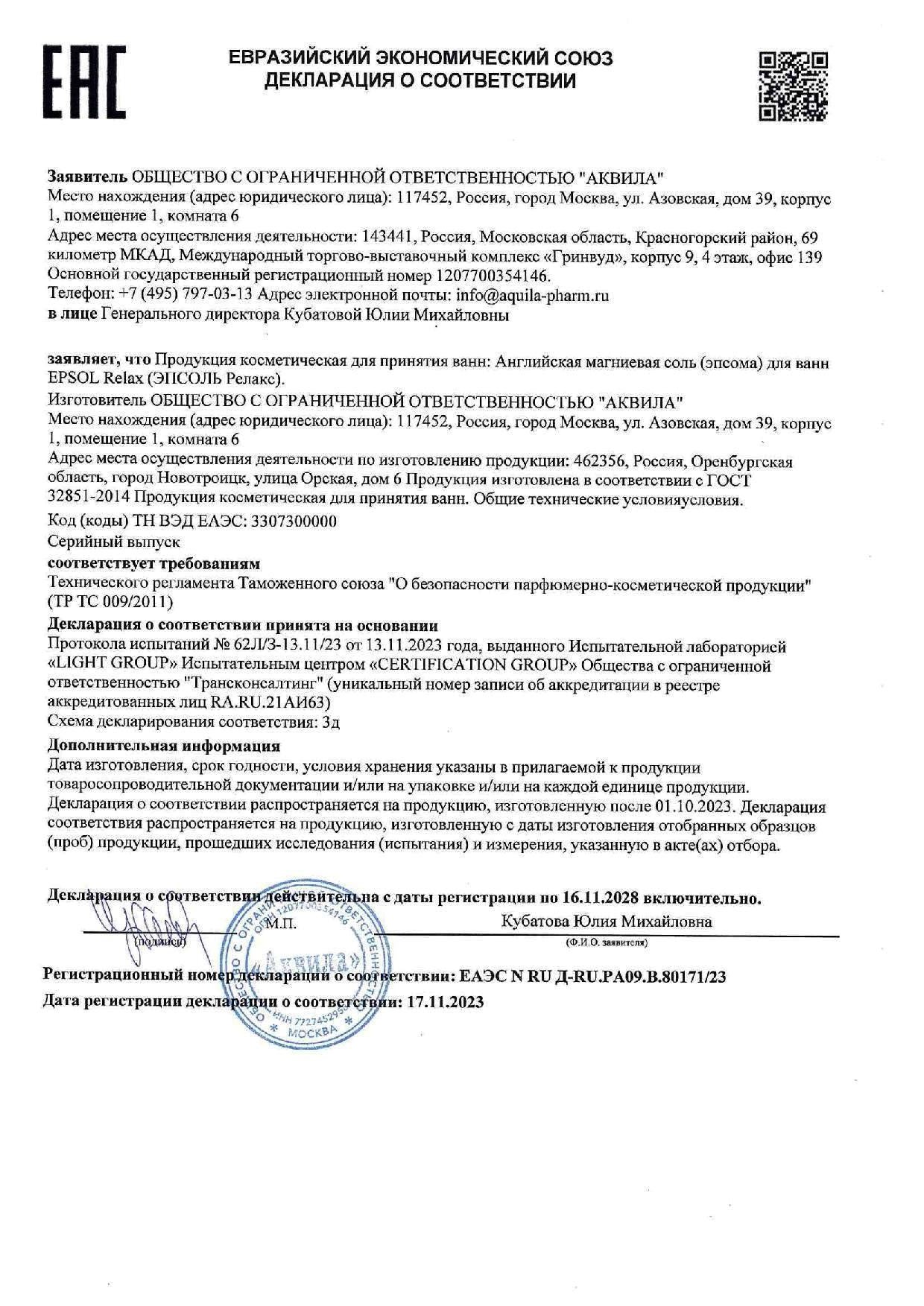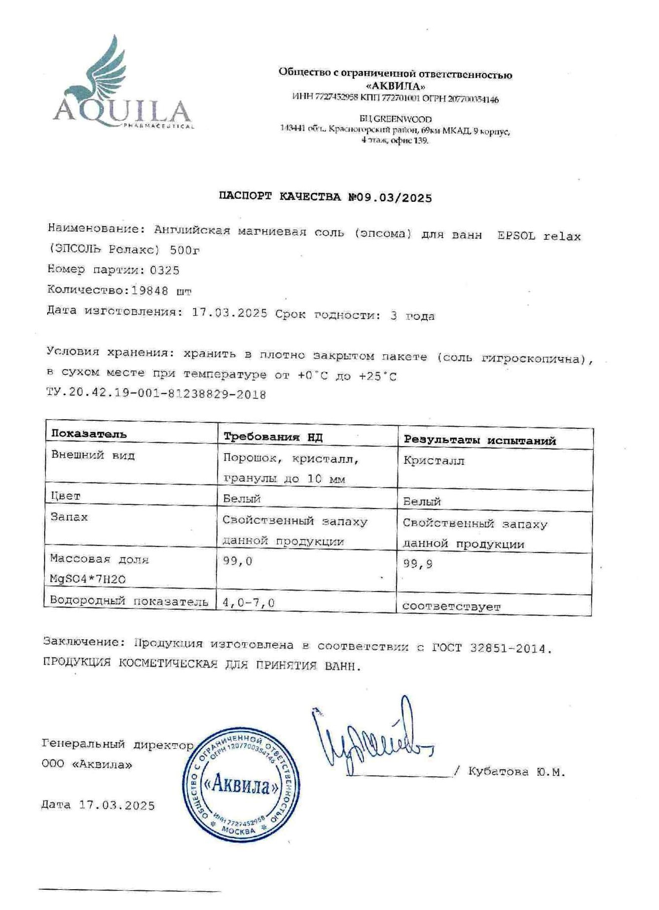 Соль английская магниевая (эпсома) для ванн EPSOL Relax (ЭПСОЛЬ Релакс), doy-pack 500г