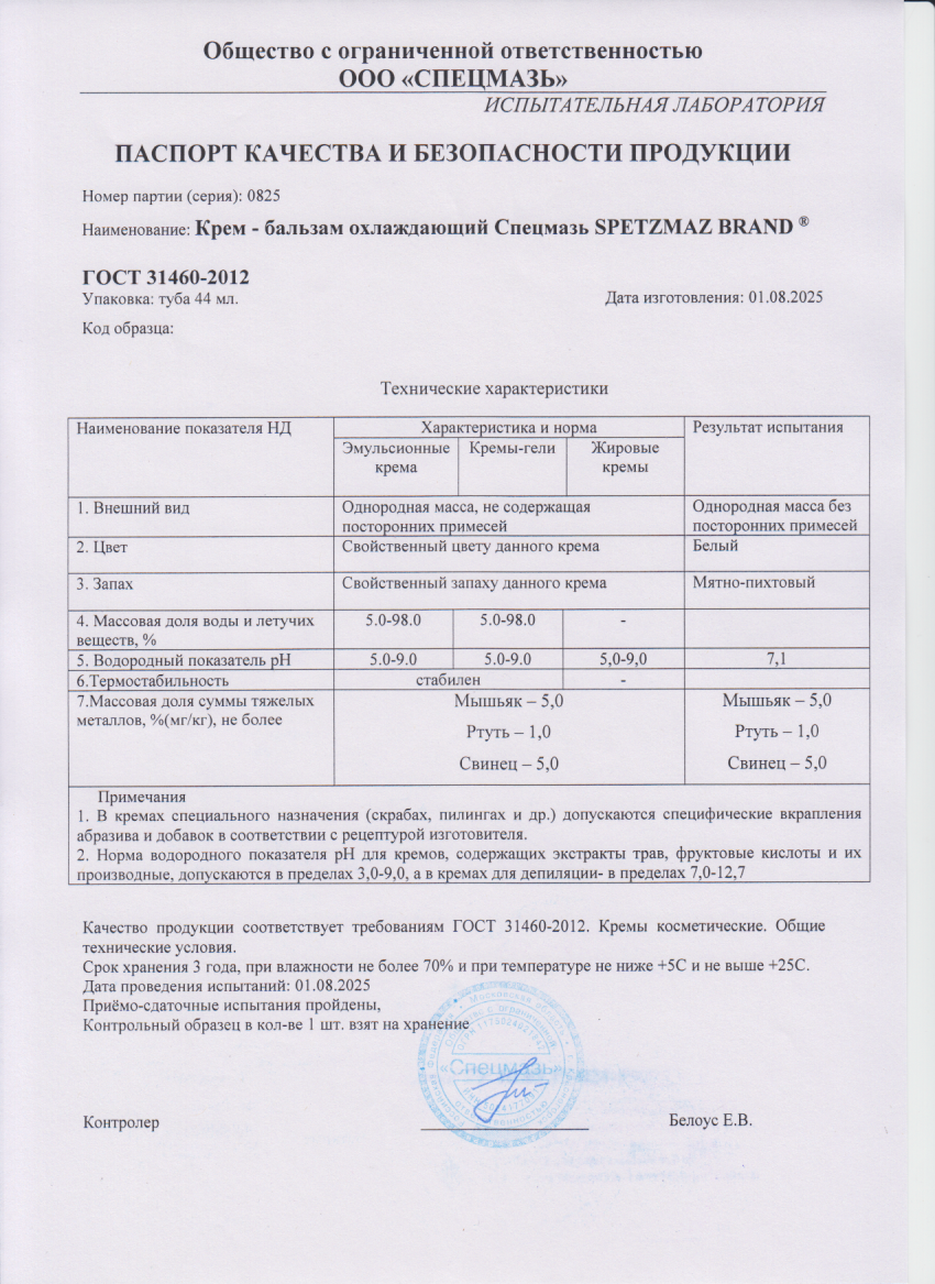 Читать далееСпецмазь SPETZMAZ BRAND крем-бальзам ОХЛАЖДАЮЩИЙ с пихтой сибирск. и мурав. спиртом и ментолом, 44 мл