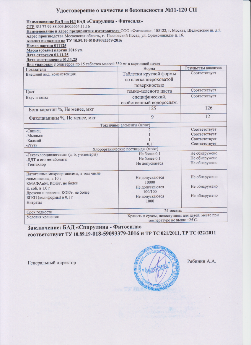 Все характеристикиСпирулина - Фитосила ® БАД, № 120 табл. х 0,35 г (блистер)