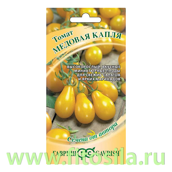 Раннеспелый (от всходов до плодоношения 100–110 дней) высокорослый сорт для выращивания в открытом грунте и пленочных теплицах. Плоды каплевидной формы, гладкие, медового цвета, массой 30 г, с приятным сладковатым вкусом и нежным томатным ароматом. Из сорта Медовая капля получаются аппетитные и яркие свежие салаты, соленья, маринады, вкусные закуски и канапе. Семена после уборки сохраняют всхожесть в течение 10 лет при оптимальных условиях хранения. Рекомендуется увеличить норму высева по истечении срока годности.