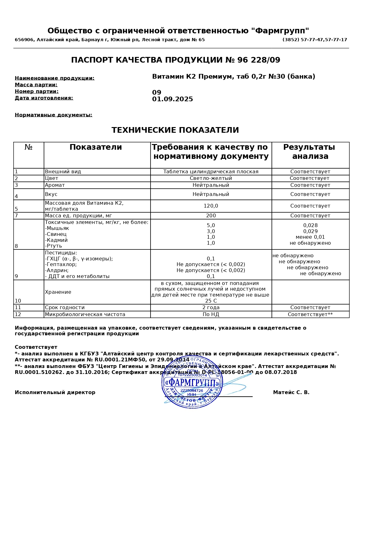 Витамин K2 Премиум производится в соответствии с высокими стандартами качества и безопасен для употребления. Однако перед началом приема любых биологически активных добавок рекомендуется проконсультироваться с врачом.