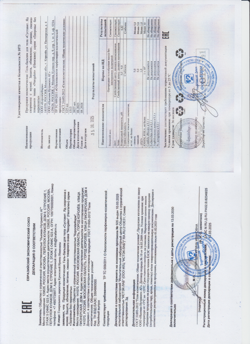 Гель-бальзам для тела "Суставит. Яд скорпиона с мумие. Защита, обновление, питание, смазка" товарного знака Neogalen (Неогален) серии "Здоровье без переплаты" – эффективное средство на основе природных компонентов. Способствует нормализации функционального состояния. Обеспечивает структурными элементами для активного обновления и гибкости. Стимулирует естественную регенерацию тканей, препятствует развитию деструктивных процессов и старению.