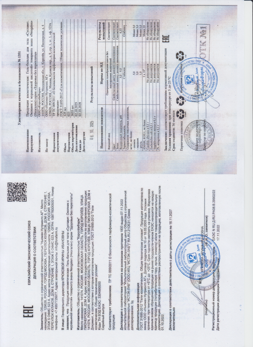 Эффективное средство на основе природных компонентов в области суставов. Стимулирует естественную регенерацию тканей, препятствует развитию деструктивных процессов и старению. Способствует нормализации функционального состояния суставов и мышц. Эффективность геля-бальзама для тела обеспечены высокой биологической активностью его натуральных компонентов. Окопник способствует восстановлению поврежденных тканей, стимулирует регенерацию костной и хрящевой ткани при заболеваниях суставов, заживляет суставные микротравмы, ускоряет процесс сращивание костей при переломах. Муравьиная кислота усиливает местное кровообращение, оказывает согревающее, местно анестезирующее, противовоспалительное действие, улучшает метаболизм ткани. Воздействуя на нервные окончания кожи и мышечную ткань, вызывает рефлекторные реакции, сопровождающиеся образованием и высвобождением энкефалинов и нейропептидов, снижающих болевые ощущения.