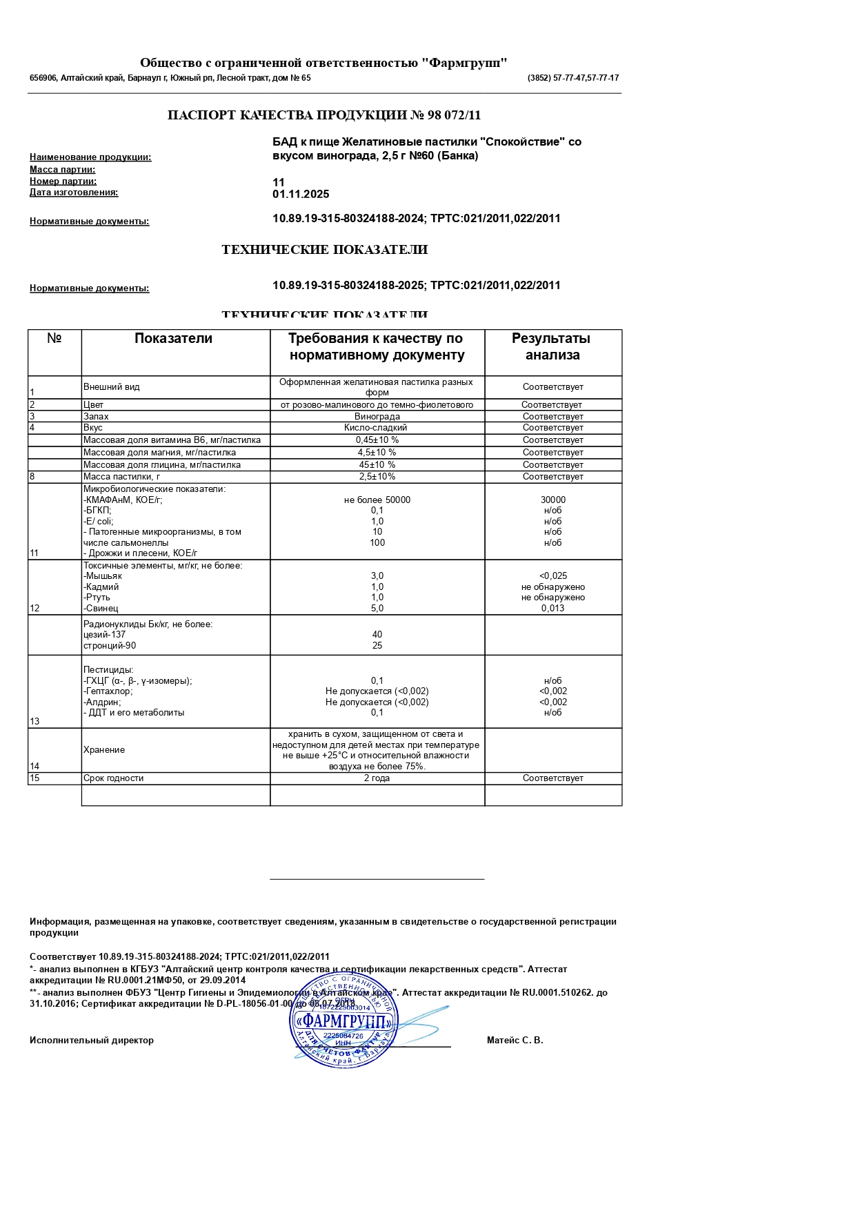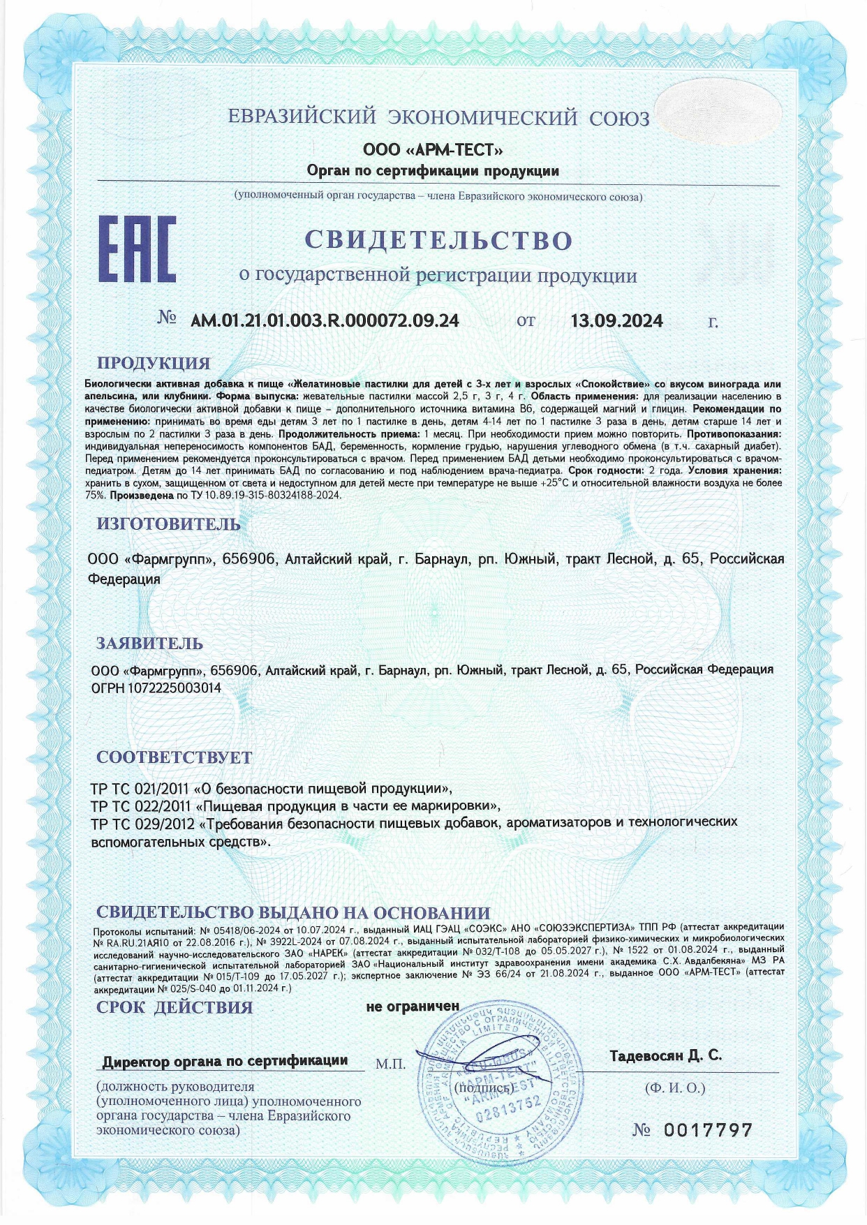 Желатиновые пастилки для детей с 3-х лет и взрослых «Спокойствие» со вкусом винограда рекомендуется в качестве биологически активной добавки к пище – дополнительного источника витамина В6, содержащей магний и глицин.