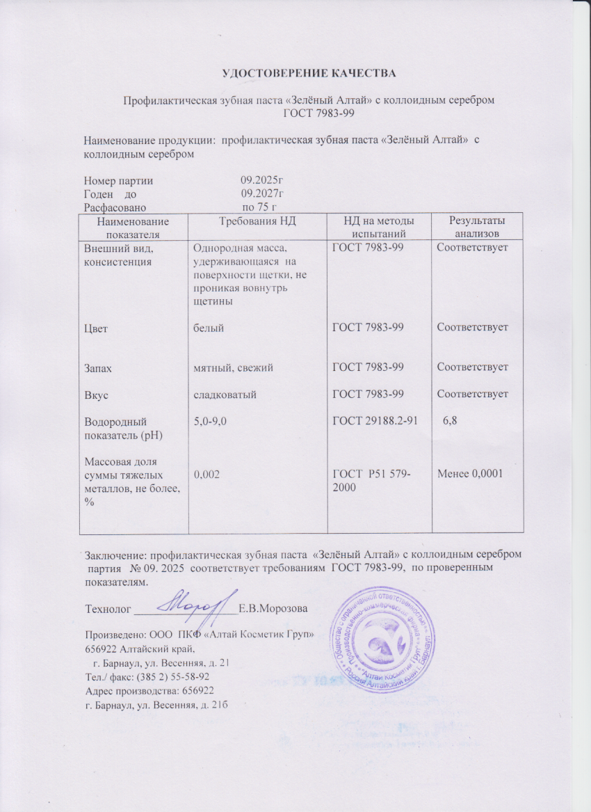 Зубная паста «Зелёный Алтай» с коллоидным серебром не содержит парабенов и лаурилсульфата.
